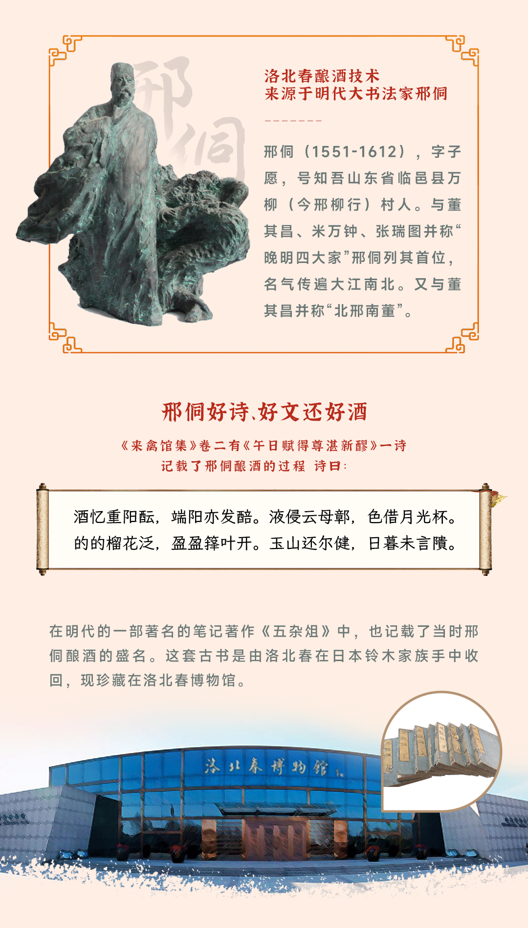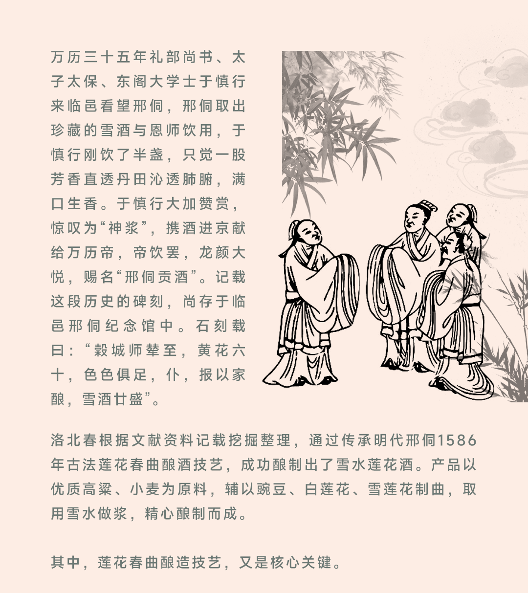 洛北春集團(tuán)始于建國前的1945年,是魯北白酒的先驅(qū),如今已成功構(gòu)建起涵蓋白酒、國際紅酒、星級酒店、金融服務(wù)及包裝印刷五大板塊的多元化產(chǎn)業(yè)格局。傳承五百年明代古法釀酒技藝,已獲“非物質(zhì)文化遺產(chǎn)”。近八十年來,斬獲國內(nèi)外十大“國字號”榮譽(yù)。秉承傳統(tǒng)與創(chuàng)新相結(jié)合的發(fā)展理念,成為中華白酒文化的傳承典范。