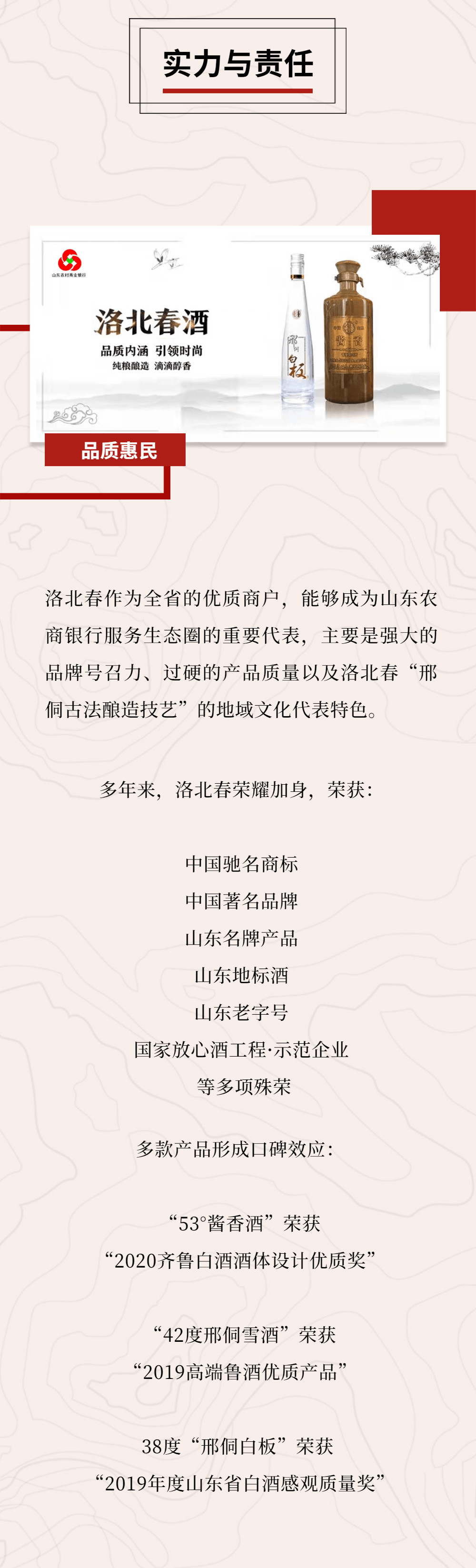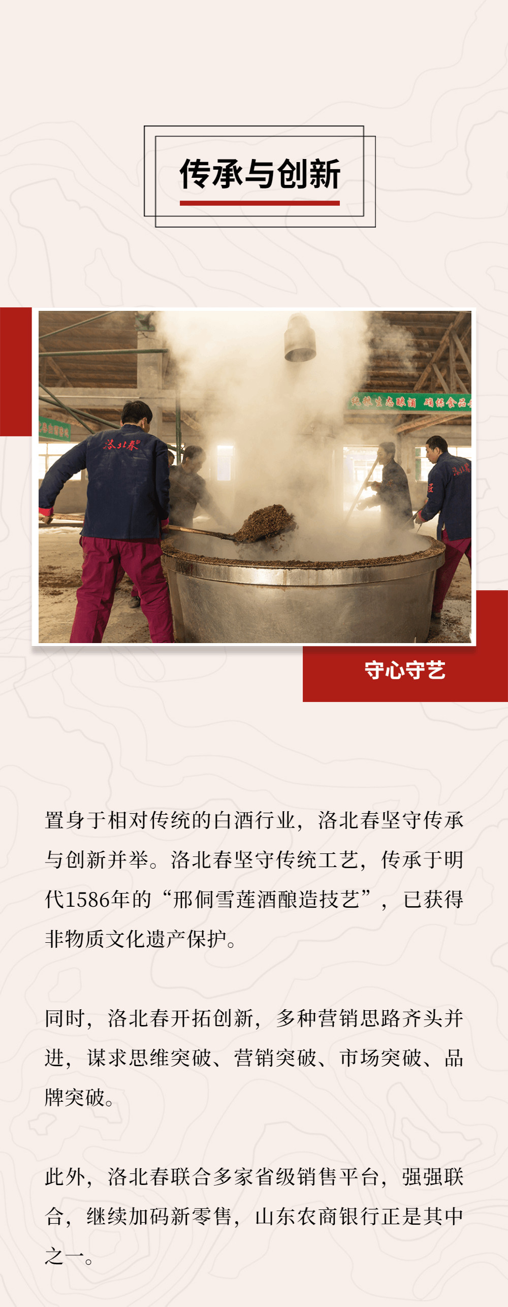 洛北春集團始于建國前的1945年,是魯北白酒的先驅(qū),如今已成功構(gòu)建起涵蓋白酒、國際紅酒、星級酒店、金融服務及包裝印刷五大板塊的多元化產(chǎn)業(yè)格局。傳承五百年明代古法釀酒技藝,已獲“非物質(zhì)文化遺產(chǎn)”。近八十年來,斬獲國內(nèi)外十大“國字號”榮譽。秉承傳統(tǒng)與創(chuàng)新相結(jié)合的發(fā)展理念,成為中華白酒文化的傳承典范。
