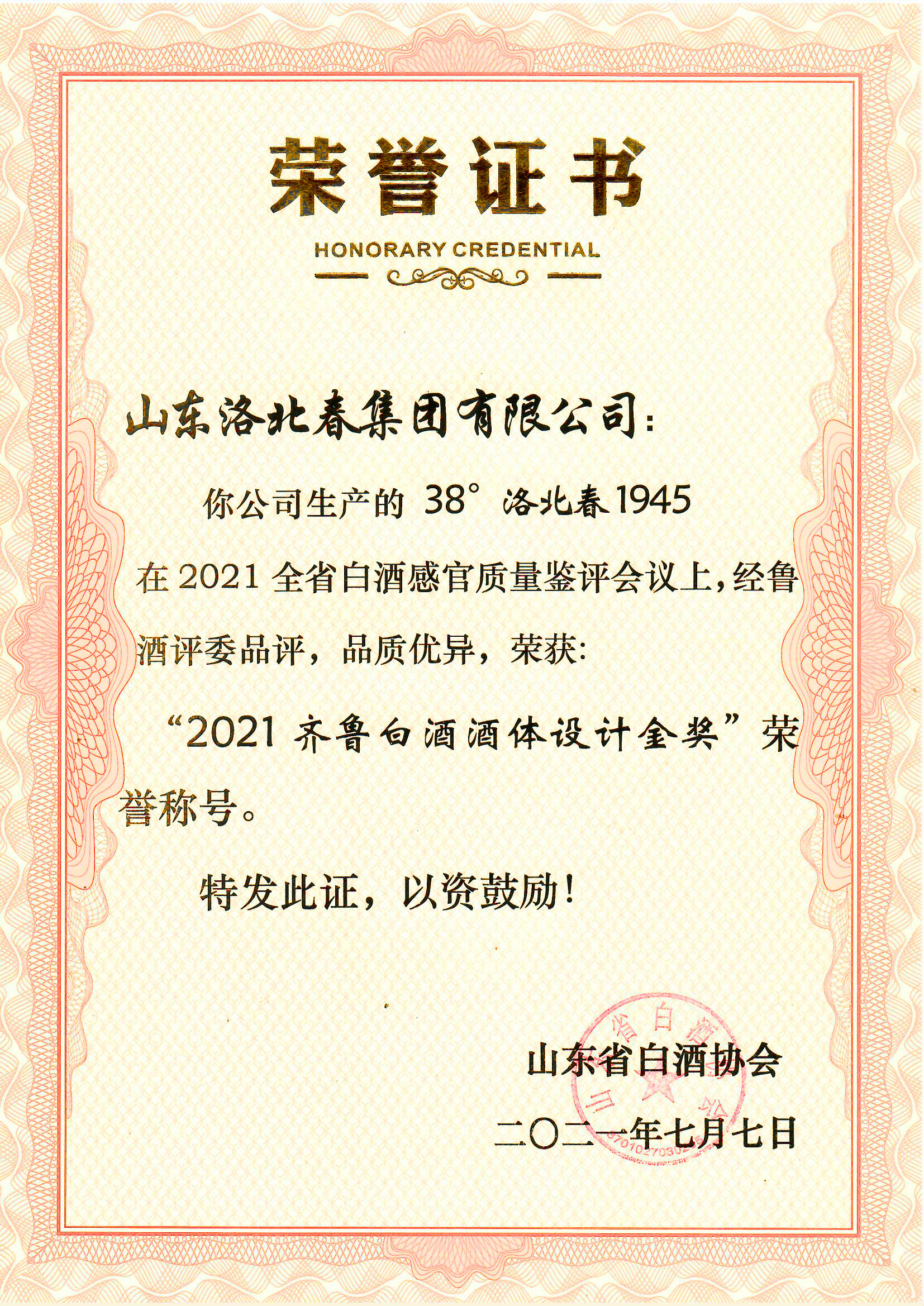 山東洛北春集團有限公司生產(chǎn)的38度洛北春1945獲得了“2021齊魯白酒酒體設(shè)計金獎”榮譽稱號